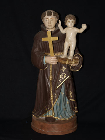 Figura masculina, vulto pleno, representado de pé, usando calçado castanho, visível no pé direito; em posição frontal, assente numa peanha marmoreada. Segura com a mão direita uma cruz latina, e na esquerda um menino nu com cabelos castanhos, e braços afastados do tronco, representado de pé sobre um livro. Figura adulta imberbe, com corte em tonsura, usa hábito castanho, debruado por um galão dourado, ornado por motivos fitomórficos e cingido por um cinturão de onde pende um cordel com quatro nós. Sobre o hábito um capuz castanho. Por debaixo deste é visível uma veste azulada debruada e ornada com motivos florais azuis.