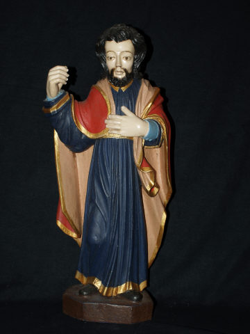 Figura masculina de vulto pleno representada de pé e em posição frontal, dirigindo o olhar para a frente. Usa cabelos pelos ombros suavemente ondeantes e barba, ambos pretos. Quanto aos panejamentos usa túnica azul cingida por cordão torcido de cor dourada, tal como os galões que rematam a veste. Lançado sobre os ombros e segura com a mão esquerda, o manto vermelho debruado a dourado de interior salmão. Braço direito soerguido e mão descaída.