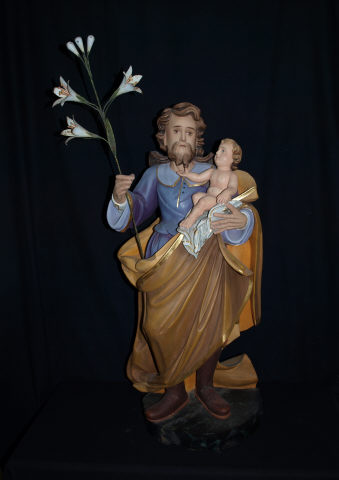 Figura masculina, vulto pleno, representada de pé, com botas castanhas, em posição frontal, assente numa peanha marmoreada circular. Cabelos ondulados e barba, ambos castanhos, enverga na mão direita um vara florida com açucenas e com a esquerda segura o menino. Veste túnica azul, com gola e botões no peito, cingida na cinta. Veste debruada com um galão dourado. Lançado sobre o ombro esquerdo um manto acobreado, decorado por galão dourado. Sentado na mão esquerda do adulto, um menino, loiro, nu, sentado sobre um manto azulado. Apresenta torção na cabeça em direcção ao rosto da figura adulta, colocando a mão direita debaixo da barba. Mão esquerda pousada sobre o manto em que se senta.