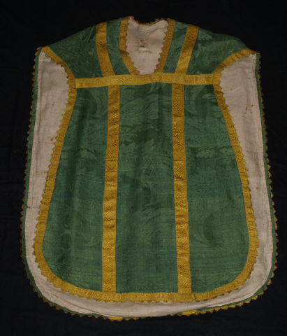 Casula de damasco verde criando um padrão fitomórfico. Frente recortada, decote em V, pilar em bico e costas arredondadas. Sebastos e orlas debruadas por galão de fio de seda amarelo, sendo o das orlas ondeante. Forro de linho creme.