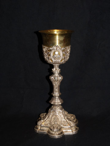 Cálice prateado, de base circular ondulada hexagonal, com moldura de escócia. Arranque hipertrofiado da haste em forma de campânula com decoração fitomórfica relevada, grinaldas, florões, volutas e cartelas ovaladas que emolduram símbolos da paixão de Cristo. Haste suportada por dois anéis hexagonais, emergindo rectilínea rematada com nó bojudo, decorado por símbolos da mesma temática. Falsa copa recortada, decorada por molduras em forma de cardióides, equidistantes, intercaladas por folhas de acanto e flores. Molduras envolvem símbolos da paixão de Cristo. Copa dourada campaniforme lisa.