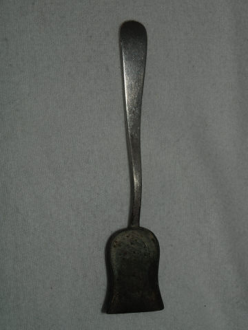Colher em prata, de forma em badil, com cabo alongado e plano, alargando até ao remate deste.