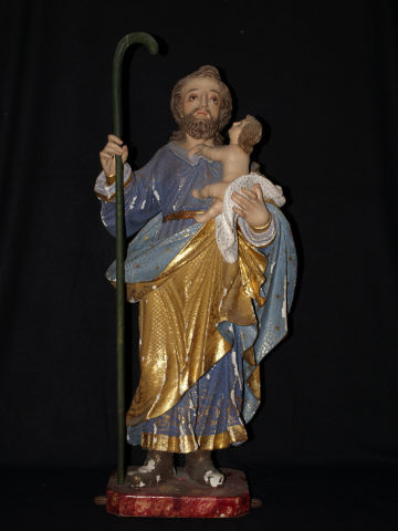 Figura masculina de média dimensão, vulto pleno, representado de pé, em posição frontal sobre uma peanha marmoreada de formato rectangular com cantos chanfrados. Segura, com o braço direito erguido, um cajado. Sentado sobre o braço esquerdo, um menino nu. Representado com barba e longos cabelos castanhos. Veste uma túnica azul, cintada e debruada por um galão dourado. È adornada na parte superior por esgrafitado de formas ondeantes e na parte inferior por decoração vegetalista. Manto castanho, lançado em trespasse sobre o ombro esquerdo, envolve-lhe o corpo. Manto é debruado pelo mesmo galão que debrua a túnica e é adornado por uma malha losangular. Forro do manto de cor azul clara adornado por pequenas estrelas douradas. O menino, sentado sobre um pequeno pano branco adornado por pequenas estrelas, está representado de perfil, direcciona o olhar para a principal figura colocando as mãos sobre o seu pescoço. Tem cabelos castanhos curtos e ondulados.