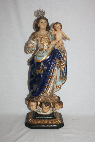 Figura feminina, vulto pleno, em posição frontal, representada coroada e de pé sobre uma nuvem ornada por cinco cabeças de crianças. Segura com a mão esquerda um menino, nu, que dirige o olhar para a frente, erguendo para o alto o braço direito, ficando o esquerdo descaído ao nível da cinta. Apresenta uma ligeira torção da cabeça para a direita, os cabelos são encaracolados e castanhos-claros. Figura adulta possui longo cabelo castanho, ondeante e que cai sobre as costas. No que concerne aos panejamentos, enverga veste branca adornada em toda a sua extensão por motivos vegetalistas e debrum, dourados. A veste é cingida por um cinto dourado, e sobre o peito uma cartela arredondada. Lançado sobre o ombro esquerdo um manto, que envolve a cinta e cai até aos pés. O manto é adornado por motivos vegetalistas dourado e com galão largo de igual cor.