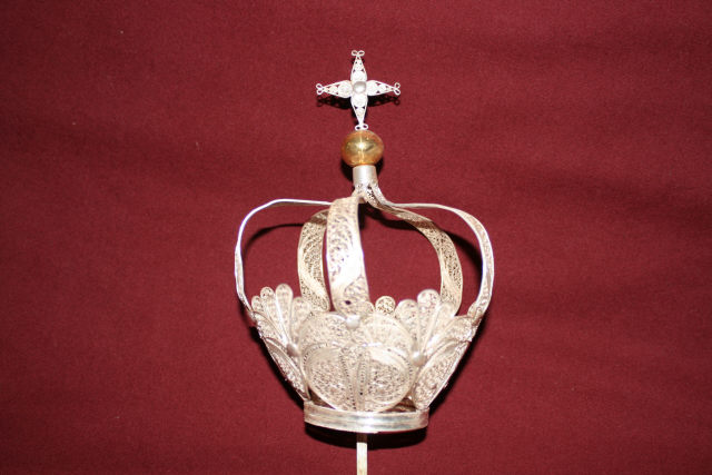 Coroa fechada de aro liso. Cesto em filigrana, do qual saem cinco imperiais, rematadas no topo por esfera encimada por cruz latina, também em filigrana.