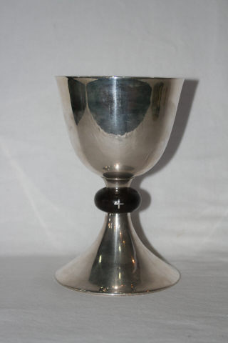 Cálice de base circular, com pé troncónico liso. Nó bojudo, guarnecido por uma cruz. Apresenta copa lisa, com interior dourado.