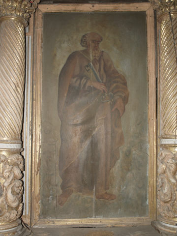Pintura sobre madeira, de formato rectangular sobre a vertical. Representada uma figura masculina, de pé. Rosto moldurado por barba e cabelos ondeantes apresentando calvície, direccionando o olhar para baixo. Na mão direita segura uma chave de grandes dimensões. Traja túnica e manto castanhos.