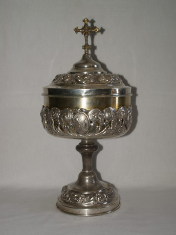 Píxide em prata de base circular emoldurada, alteada com ornamentação relevada assente em acantos relevados, com registo central ligeiramente estrangulado. Haste curta com nó em forma de urna achatada. Copa dourada semi-esférica achatada com falsa copa prateada de decoração semelhante à base, com cartelas ovaladas de fundo puncionado circunscrevendo motivos iconográficos, com remate de filete saliente. A tampa é de encaixe de orla lisa também ela de decoração semelhante à base, com saliência central e com remate em cruz latina dourada de pontas segmentadas.