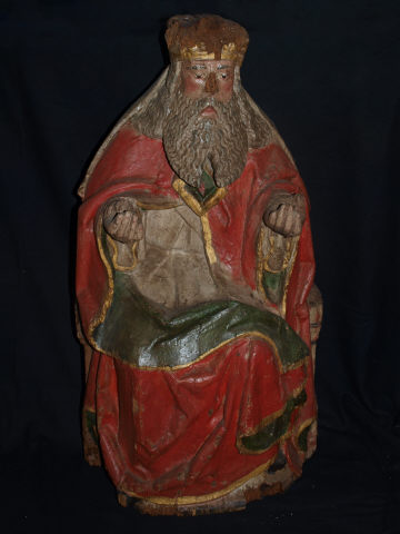 Composição escultórica de linhas bem definidas, assente numa figura masculina anciã entronizada, em madeira policromada trabalhada a ¾ com as costas cavadas, que se apresenta sentada, numa posição frontal de feições anatómicas muito rudimentares. O ancião flecte os braços e afigura-se com as mãos semicerradas voltadas para cima. Surge com rosto envelhecido com barba grande grisalha, recebe coroa (integrada) dourada, enverga capa vermelha forrada a verde com remate dourado cobrindo quase a totalidade do corpo, apensas com ligeira abertura na cinta, e com formas bem vincadas.