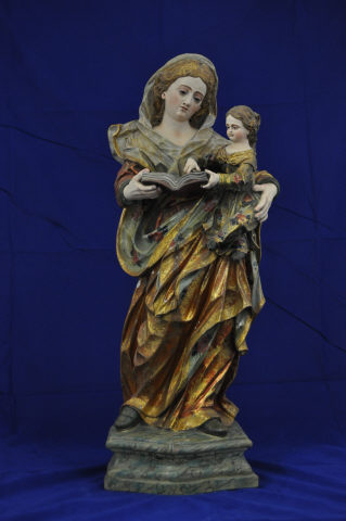 Figura feminina, em vulto pleno, de pé e em posição frontal, com uma menina sobre o braço e mão esquerda. Figura adulta enverga túnica e manto, esvoaçantes, estofado e policromado, com galão dourado e adornada por motivos florais. A menina de longos cabelos castanhos, atados, usa vestido decorado por motivos vegetalistas policromos, com orlas douradas. No centro da composição um livro aberto, para o qual ambas dirigem o olhar. O livro é seguro pela mão direita da figura adulta e pela esquerda da menina, tendo o dedo indicador da mão direita a apontar para o livro.
