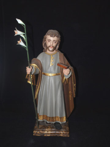 Figura masculina, de vulto pleno, representado de pé em posição frontal assente numa peanha marmoreada. Com o braço direito, erguido ao nível da cinta e dirigido para a frente, segura a vara de açucenas, do lado oposto e com a mão esquerda, semi-flectida ao nível da conta, segura um instrumento de carpinteiro em madeira. Representado com barba e longos cabelos castanhos, enverga uma túnica cinzenta, cintada e debruada por um galão dourado. Túnica apresenta gola com três botões e orla inferior larga, ambas douradas. Lançado sobre os dois braços um manto castanho ornado por debrum e motivos florias dourados. Nos pés usa calçado fechado de cor preta.