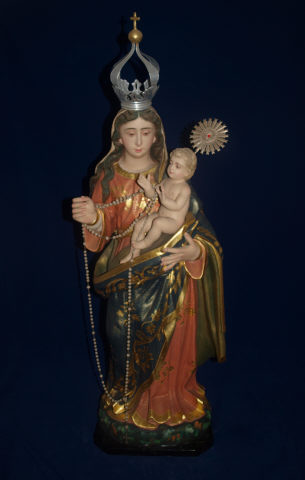 Figura feminina, de vulto pleno, representada de pé em posição frontal, assente sobre uma peanha marmoreada. Dirigindo o olhar para a frente, segura com a mão, sobre o lado esquerdo, a figura de um menino nu. Pendurado nos braços direitos das duas figuras, um rosário. A figura adulta apresenta sobre os ornatos vegetalistas e filetes dourados. Lançado sobre o ombro esquerdo e envolvendo-lhe a cintura um manto azul-escuro, com ornatos florais e filete dourados.