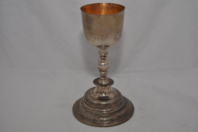 Cálice de base circular, pé em forma de campânula alteada em dois registos o primeiro decorado com motivos vegetalistas, e pontilhado, o segundo com volutas incisas e pontilhado. O arranque da haste apresenta forma côncava com anel chanfrado. Haste abalaustrada apresentando no primeiro anel decoração vegetalista, de seguida surge nó periforme liso. Copa lisa de tipo campaniforme. Exterior prateado e interior dourado.
