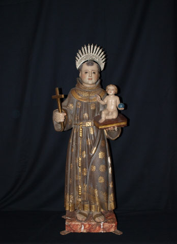 Figura masculina com um menino, em vulto pleno, de pé e em posição frontal. Apresenta na sua mão esquerda um livro, sobre o qual se encontra um menino nu, sentado, voltado para a frente, segurando com a mão esquerda um globo azul e com a mão direita erguida em sinal de bênção. A figura masculina, ergue, na mão direita, uma cruz. É representado com resplendor, com cabelo de corte em tonsura, com vestes franciscanas, decoradas e debruadas a dourado, cingidas na cintura por cordão dourado com três nós. Apresenta-se calçado com sandálias castanhas.