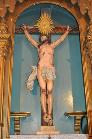 Figura masculina de vulto pleno, de cabelos e barba castanha. Apresenta-se pregada pelas mãos e pés a uma cruz latina, com várias chagas visíveis em todo o corpo. Tem os braços verticalizados, e surge com cendal branco envolto à cintura por um cordão dourado. Apresenta a cabeça inclinada para a sua direita e para cima, de olhos abertos, com coroa de espinhos na cabeça. A cruz latina tem a forma de tronco de madeira, aprsentando na intersecção dos braços, acima da cabeça da figura masculina, um resplendor losangolar dourado com raios setiformes. A rematar o braço superior surge uma cartela rectangular branca com inscrição.