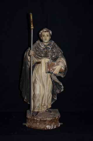 Figura masculina, de vulto pleno, representada de pé, em posição frontal, com pé direito ligeiramente avançado. A imagem apresenta cabelo castanho em corte de tonsura. O braço direito ergue-se, segurando com a mão um báculo, enquanto, com a mão esquerda, encosta ao corpo um livro fechado, à altura da cintura. Traja túnica branca, sobrepujada por capa preta, com capuz e escapulário, lançada na frente em trespasse, prendendo sob o livro e sob a faixa castanha que a cinge à cintura.