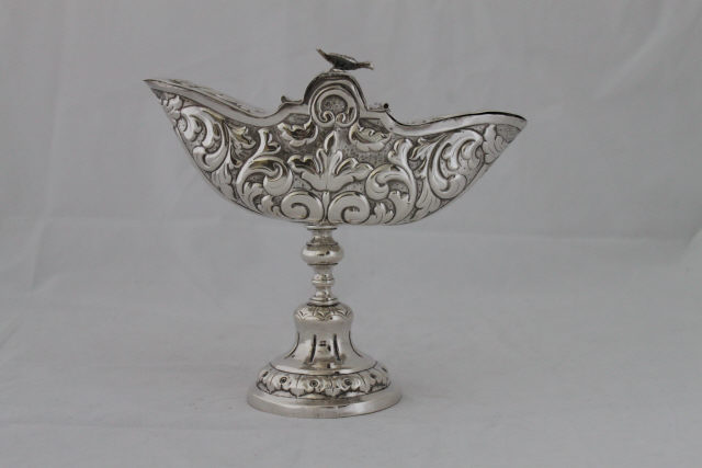 Naveta de base circular alteada, decorada por friso vegetalista. Pé campaniforme com caneluras incisas e nó periforme. Vaso naviforme, profusamente guarnecido por volutas acantiformes. Bordo definido por tarja lisa. Cobertura formada por três secções, ornada por motivos vegetalistas e pontilhado. A secção central apresenta-se convexa, rematada por uma ave em posição de voo. Uma das secções das extremidades funciona como tampa, unida ao corpo da naveta através de uma dobradiça.