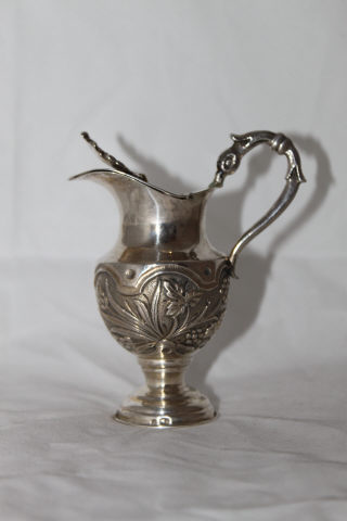 Galheta de base circular sobrepujada por corpo bojudo, ornamentado folhas de parra, cachos de uvas e folhagem com espigas de trigo. Boca lisa. A tampa, unida ao corpo da peça por dobradiça, apresenta no topo cacho de uvas. Asa formada por volutas.