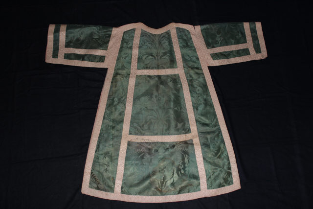 Dalmática em tecido damasco verde. O corpo apresenta ao centro, em desenvolvimento vertical, três painéis de tamanhos irregulares, delimitados por galões pérola. As orlas da peça e os painéis ornamentais das mangas são definidos por igual galão. Forro em tecido rosa.