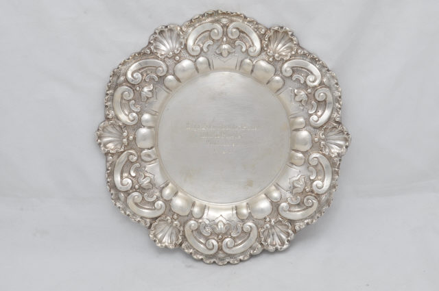 Salva de forma circular, de bordo recortado ondeante. Orla ornada por motivos conquiformes e volutas, seguidas de faixa formada por motivos geométricos rectangulares. Fundo rebaixado liso.