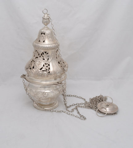 Turíbulo em forma de urna, com base circular lisa. Caldeira guarnecida por volutas acantiformes sobre fundo pontilhado, seguindo-se o bordo terminal de faixa côncava lisa, com três anéis para passagem das correntes de suspensão. Chaminé com bordo inferior liso, também com três anéis para passagem das correntes, formada por duas secções vazadas decorada por motivos florais e volutas acantiformes, dispostos alternadamente com painéis estreitos de esquadria. Entre ambas as secções apresenta tarja de folhagem. Peça rematada por coruchéu, com argola de suporte no topo. Guarda-mão circular, de centro convexo, com argola e orifício central para passagem das correntes de suspensão.