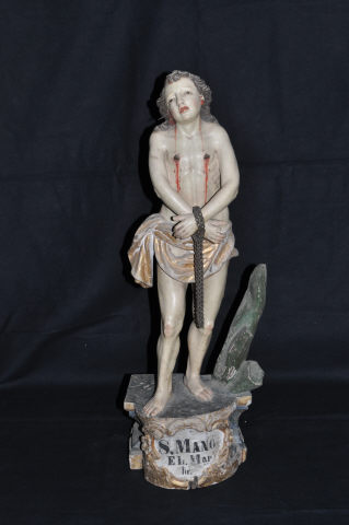 Figura masculina de vulto pleno, de pé e em posição frontal. Apresenta cabeça e olhar voltados para cima e ligeiramente para a direita. Apresenta-se despido, coberto com cendal branco e dourado preso à cintura. Apresenta dois cravos no peito, no lugar de cada um dos seios. As mãos cruzam-se à frente presas por uma corrente. Assenta sobre base em forma de tronco, com ramo verticalizado junto à perna esquerda.