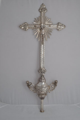 Cruz processional de prata, de braços rectos, com extremidades decoradas por volutas acantiformes. Os braços da cruz apresentam-se chanfrados em três faces convexas, a central com motivos vegetalistas incisos e as laterais com entrançado pronunciado. A intersecção dos braços, apresenta aplicação de resplendor oval com raios setiformes e alberga figura masculina crucificada, também esta encimada por resplendor inciso. A haste apresenta secção inferior lisa e nó em forma de troféu, profusamente decorado por motivos vegetalistas de folhagem de acanto, cartela e volutas. Este tem duas asas sinuosas, decoradas por volutas acantiformes de onde sai um anjo alado. O arranque da cruz é decorado por motivos acantiformes.