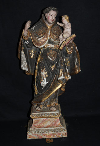 Figura masculina com menino, em vulto pleno, de pé e em posição frontal. A imagem é representada de cabelo em corte de tonsura. Surge com o braço direito flectido, mostrando a mão direita fechada. Na mão esquerda tem um livro aberto, sobre o qual está sentado um menino. Quanto aos panejamentos, traja vestes franciscanas, túnica e capa pretas orladas a dourado e decoradas por motivos vegetalistas a dourado, e corda na cintura também dourada, caindo da cintura do lado direito com três nós. Representado de sandálias castanhas. O menino, de caracóis dourados, apresenta-se nu, sentado, voltado para a direita, com o braço direito levantado segura com a mão direita as vestes da outra figura, sendo que o braço esquerdo surge flectido, assentando a mão esquerda junto ao seu peito.
