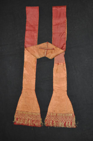 Estola de damasco rosa, criando padrão fitomórfico, de extremidades semicirculares. No fecho, apresenta cruz de galão de fio carmim e fio metálico dourado. Junto à baínha, é rematada por galão de fio carmim e fio metálico dourado, composto por franja em malha quadriculada, em fio metálico dourado, deixando antever o forro, franjado, em tecido carmim.