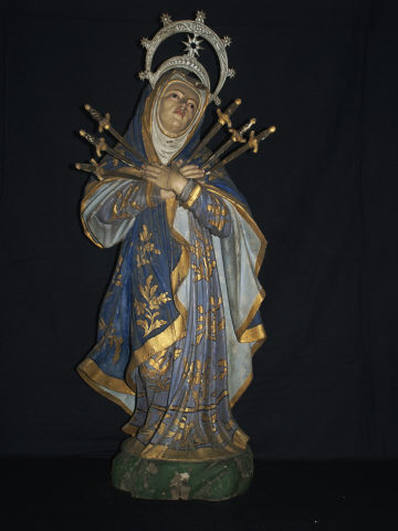 Figura feminina, em vulto pleno, de pé e em posição frontal. Rosto adulto, coberto por coifa branca debruada a dourado, com o olhar dirigido para o lado esquerdo e para cima, os braços flectidos junto ao corpo e as mãos sobre o peito, por trás das quais são visiveis seis espadas espetadas no peito. Traja túnica roxa pregueada debruada e ornada no corpo com padrão fiotmórfico a dourado, em grande parte coberto por longo manto azul que cobre a cabeça e cai sobre as costas e frente do corpo, cruzando-se no peito, debruado e ornado com padrão fitomórfico a dourado. Resplendor metálico, em forma de crescente invertido, orna a cabeça.
