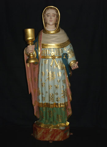 Figura feminina, em vulto pleno, de pé e em posição frontal. Braço direito flectido e em frente, com a mão a segurar um cálice dourado; braço esquerdo, junto ao corpo e em frente com a mão em gesto de sustentar algo. Traja vestido verde, com túnica curta azul claro, cintadas, goleadas, debruadas e ornadas com padrões vegetalistas a dourado. Cobre o conjunto manto azul forrado a rosa, pendente do ombro direito e indo prender debaixo do braço esquerdo, debruado e ornado a dourado. Rosto moldurado por longos cabelos castanhos, em grande parte cobertos por coifa pérola em forma de capuz, debruada a dourado e ornada com esgrafitado.
