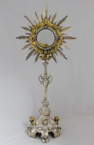 Ostensório, em prata, com base triangular tipo piramidal, de duas faces, assente em quatro pés com perfis moldurados por volutas, lisos. Faces da base molduradas por volutas que formam três painéis sucessivos de fundo liso, ornamentando o painel intermédio cartela oval aberta no painél, moldurada e ornada exteriormente por festão vegetalista encimado por laço, carregado no interior por elemento iconográfico relevado sobre fundo puncionado. Haste balaustriforme, em dois níveis, de recorte ondeante moldurado por volutas e formando painéis ornados por apontamentos vegetalistas relevados. Intersecção dos níveis alargada, identificando-se como o nó, que é ladeado por duas asas em S truncado formadas por volutas. Hostiário circular, com câmara central em metal dourado, envidraçada e com porta no verso, emoldurada e enquadrada por friso de cornucópias floridas e querubins, tendo dois querubins no seu arranque, com friso de pedraria a moldurar o vidro, substituído no verso por friso relevado a imitar pedraria. No interior lúnula em forma de querubim, em metal dourado. Enquadram a câmara raios setiformes em prata.
