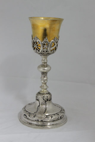 Cálice de base circular alteada em três registos. Base moldurada e segmentada, por meio de volutas, folhagem, concheado e elemento floral relevados e incisos, criando quatro painéis lisos, de rebordo ondeante. Haste balaustriforme lisa, com nó em calote esférica ornada com flores e folhagem incisa. Sobre a copa campaniforme em prata dourada está uma falsa copa vazada ornamentada com painéis formados por volutas em que se inserem símbolos da Paixão, intercalados por painéis formados por volutas e ornados com motivo vegetalista e floral.