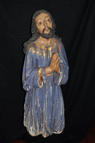Figura masculina de vulto pleno, de joelhos em posição frontal. Tem rosto adulto, moldurado por longos cabelos castanhos. Cabeça inclinado para o lado direito tendo o olhar dirigido para o alto. Braços flectidos com as mãos unidas junto ao peito. Traja túnica azul pregueada, debruada, cintada e decorada a dourado.
