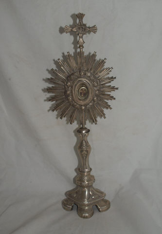 Relicário de formato circular com resplendor de raios setiformes agrupados em conjuntos de diferentes dimensões. Ao centro um óculo, ovalado, envidraçado, com camafeu rm prata com cruz no interior com fragmento de madeira. Óculo emoldurado por anjos e nuvens relevados. Base losangular assente em quatro pernas, decorada por motivos geométricos e vegetalistas, com cartela no centro. Fuste balaustiforme com decoração da mesma temática.