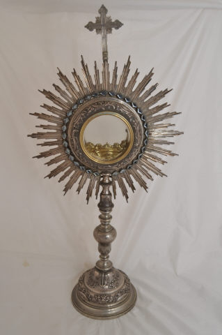 Ostensório de base circular alteada em registos. Base campaniforme alteada decorada por motivos acantiformes, concheados e volutas. Haste formada por sucessivos registos, com nó periforme invertido. Hostiário em forma de sol raiado, composto por raios setiformes, com câmara central envidraçada e porta no lado oposto. Câmara delimitada por cercadura de pedraria e motivos acantiformes relevados. Lúnula dourada amovível, definida por dois querubins. Peça rematada por cruz latina de extremidades lóbuladas.