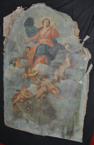 Pintura a óleo sobre tela, de formato rectangular com a parte superior semi- circular, disposta na vertical. Representa cena de exterior com fundo de nuvens. A composição desenvolve-se em espiral desde o primeiro plano ao plano superior onde se encontra a figura principal, esta surge sentada, veste túnica vermelha e mostra manto azul esvoaçante, apresenta os braços abertos e olhar direcionado para cima. A envolver a figura surgem diversas figuras de crianças aladas segurando em pedaços da nuvem onde se senta a figura feminina. Em primeiro plano surge figura de criança alada segurando várias flores que vai deixando cair.
