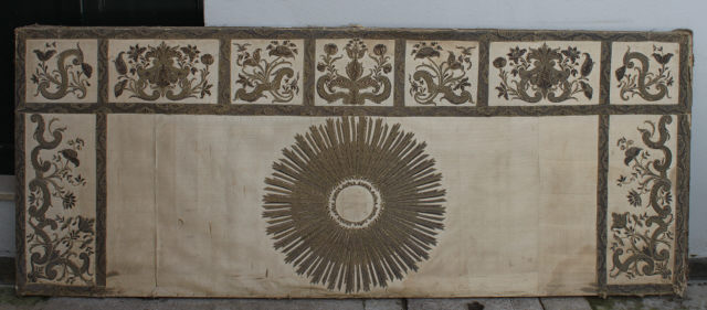 Frontal de corpo em tecido pérola com frontaleira e tiras laterais formadas por galões de fio metálico dourado, ornados por elementos florais em molduras polilobadas. Campo central ornado a dourado por resplendor circular de raios setiformes. Frontaleira e tiras laterais compostas por painéis decorados por volutas, motivos acantiformes e florais. Forro em linho.