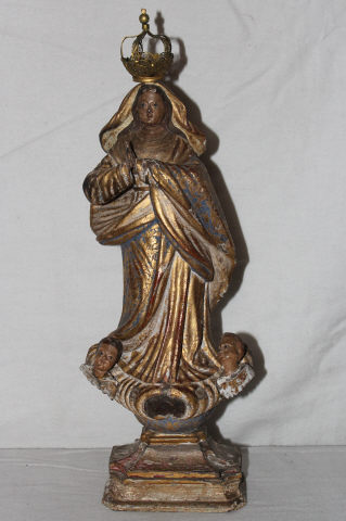 Figura feminina em vulto pleno, representada de pé sobre uma nuvem ornada por dois querubins. Figura adulta apresenta longos cabelos castanhos, que lhe cai sobre os ombros. Tem as mãos postas à altura do peito, em oração. Apresenta véu sobre a cabeça e túnica sobrepujada por manto.