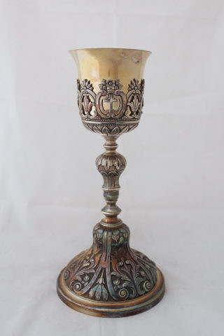 Cálice de base circular. Com pé tronconiforme constituído por painéis, preenchidos por folhagem e motivos florais. Painéis separados entre si por motivo relevado com enrolamento na extremidade inferior. Haste abalaustrada, composta por sucessivos anéis salientes e lisos. Nó periforme, ornamentado por motivos fitomórficos em todo o diâmetro.