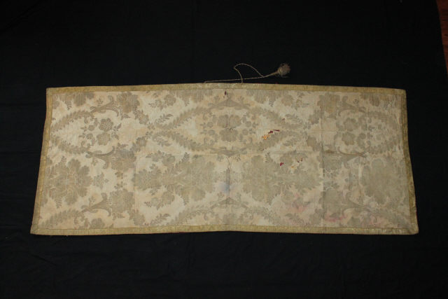 Véu em damasco de seda pérola, lavrado a fio metálico dourado e prateado, criando densa malha vegetalista. Peça debruada por galão de fio metálico dourado. Possui cordão rematado por borla. Interior em damasco de seda carmim, lavrado a fio de seda mostarda.