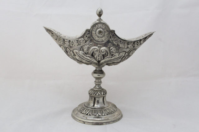 Naveta prateada de base circular ornada por faixa vegetalista, com pé campaniforme decorado por caneluras incisas. Haste balaustriforme com nó em forma de urna, ornado por anéis salientes moldurados por filetes incisos. Vaso naviforme de motivação vegetalista, floral e concheada. Remate do vaso ornado por tarja em grinalda com cartela circular com florão. Cobertura da peça dividida em três painéis, dois dos quais, ornados por cartelas molduradas com campos de motivação volutiforme e foliácea afrontadas, com remate florido, em fundo estelar inciso. Os dois painéis funcionam como tampa, possuindo sistema de dobradiça. O painel central da cobertura é ornado por flor de seis pétalas cercada por elementos foliáceos, com pega saliente ovoide, com filetes incisos.