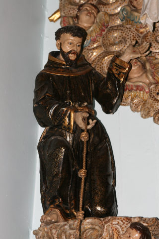 Figura masculina, de vulto pleno, representada com o joelho esquerdo fletido, pousado sobre um conjunto de nuvens, ornado frontalmente por três querubins. Surge com a cabeça inclinada e voltada para a esquerda, apontando o queixo para baixo, para onde dirige o seu olhar, com boca entreaberta. O seu rosto é moldurado a castanho pelos seus cabelos em corte de tonsura e barba bífida ondeantes. Veste hábito castanho comprido e com capuz, ornado e orlado a dourado, deixando descoberto o seu pé direito descalço, sendo cingido à cintura por cíngulo de quatro nós. Com ambos os braços fletidos, soergue o esquerdo, voltando a palma da mão para o alto, enquanto o direito desce, junto ao corpo, apresentando na mão o cíngulo com três nós, ao nível da sua cintura.