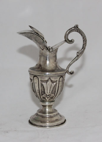 Galheta prateada de formato vasiforme, com base circular de moldura compósita e pé tronconiforme, alteado em dois registos. Corpo com bojo dilatado, abraçado por campos de fundo pontilhado, ornados por motivo fitomórfico relevado, em alternância com gomos de molduração incisa, com remate liso do colo. Gargalo com bico pronunciado, com tampa ogival com sistema de dobradiça e pega ornada por motivo fitomórfico saliente. Asa em forma de S invertido, de expressão vegetalista volutiforme.