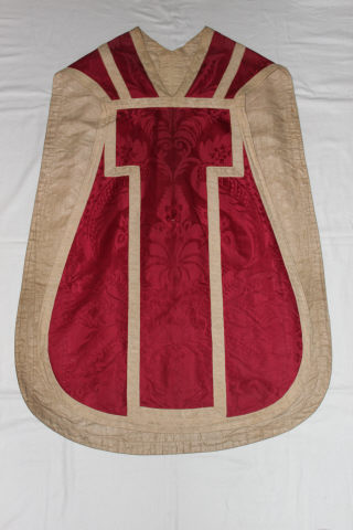 Casula de frente recortada, com decote em "V" e pilar em bico. Corpo em damasco de seda carmim. Galão do sebasto e orlas em fio de seda creme. Forro em linho.