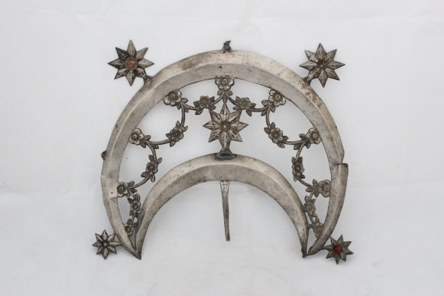 Resplendor em forma de crescente, de secção lisa, facetada com quatro estrelas a circundar a peça, guarnecidas no centro por pedraria. No campo interior, destaca-se o fundo vazado, com grinaldas de flores a preencher. Ao centro, uma estrela de oito pontas com pedraria ao centro. Possui espigão.