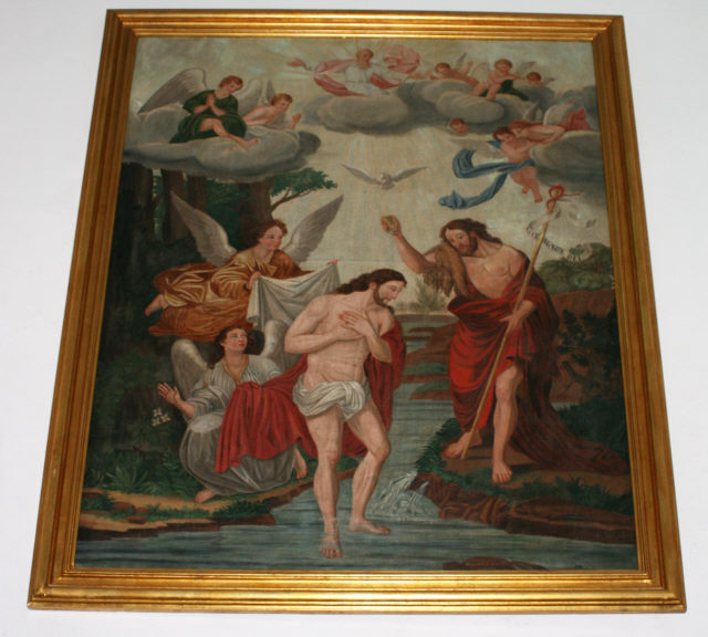 Pintura sobre tela, de média dimensão, rectangular e disposta na vertical. A tela é dominada por duas figuras masculinas, uma situada à direita da composição, de rosto adulto moldurado por longos cabelos e barba castanhos, de pé e em posição lateralizada à direita, com o corpo coberto por manto vermelho debruado a peles, deixando parcialmente descoberto o peito. Tem braço esquerdo pendente junto ao corpo suportando cruz castanha de haste longa, ornada com flamula inscrita, enquanto o braço direito se ergue ao nível da cabeça e derrama água de uma concha sobre a cabeça da segunda figura. Esta situa-se à esquerda da composição, dentro de um curso de água, com rosto adulto moldurado por cabelos e barba castanhos, de pé e inclinada, em posição lateralizada à esquerda, com os braços flectidos e cruzados no peito. Está despido e com a cintura coberta por cendal branco, vendo-se pendente do braço esquerdo manto vermelho que cai sobre as costas. Representação enquadrada em fundo exterior com curso de água, vegetação e céu azul. Do extremo superior centro da tela, de maciço de nuvens onde se vêm anjos e querubins, emerge raio de luz que incide sobre as figuras e de onde desce pomba branca, de asas abertas, e sobre o qual se vê figura masculina, representada no torso e membros superiores, trajando túnica branca sobrepujada por manto rosa, de braços abertos. Rosto idoso, resplendoroso, moldurado por cabelo e barba brancos. Por trás da figura representada à esquerda são visíveis dois anjos, um ajoelhado, segurando o manto vermelho, e o outro em voo, com pano branco nas mãos, que se perfilam em direcção à cena principal.