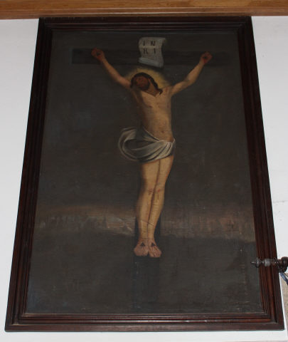 Pintura sobre tela, de grandes dimensões, de formato rectangular, disposta na vertical. Representação em exterior, indistinto mas tendo visível no inferior uma faixa representando estrutura urbana em distância. No centro da composição, surge uma figura masculina crucificada, em posição frontal. Corpo despido e coberto apenas na cintura, por cendal branco. Rosto adulto, nimbado, de olhar dirigido para o alto, moldurado por cabelos e barba castanhos.