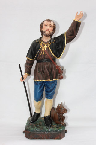 Figura masculina, em vulto pleno, de pé em posição frontal, com pé direito recuado. Rosto adulto moldurado por cabelo e barba castanhos. Braço direito junto ao corpo e a segurar vara, braço esquerdo elevado para o alto. Traja calções azuis, meias brancas, túnica curta castanha cintada com faixa preta e debruada a dourado. Atravessa o peito bolsa castanha com cabaça, pende do pescoço cruz dourada. Sobrepuja o conjunto capelo preto debruado a dourado, preso por cordão dourado. Calça sapatos pretos. No inferior direito da escultura é visível, deitado, um boi.