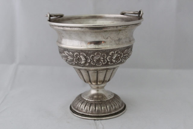 Caldeira de base circular. Pé decorado por gomos estriados, seguindo-se haste lisa estrangulada. Caldeira abraçada inferiormente por friso de caneluras lisas, antecedendo o bojo, guarnecido por grinalda, sobre fundo pontilhado. Bordo covado liso. Asa curvilínea, definida por três segmentos em voluta.